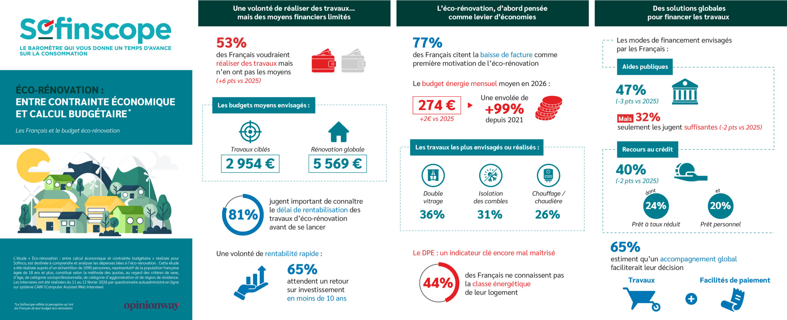 Dans un contexte de pression budgétaire durable, la question de l’éco-rénovation s’impose dans les arbitrages des ménages français. Si la conscience de la nécessité d’agir sur la performance énergétique de son logement est largement partagée, le passage à l’acte se heurte au poids du budget. Entre motivation économique, exigence de rentabilité et recours aux solutions de financement, les Français développent une approche pragmatique de la rénovation énergétique. Cette étude OpinionWay pour Sofinco décrypte les tensions, les arbitrages et les nouveaux leviers qui redessinent les dépenses d’éco-rénovation.