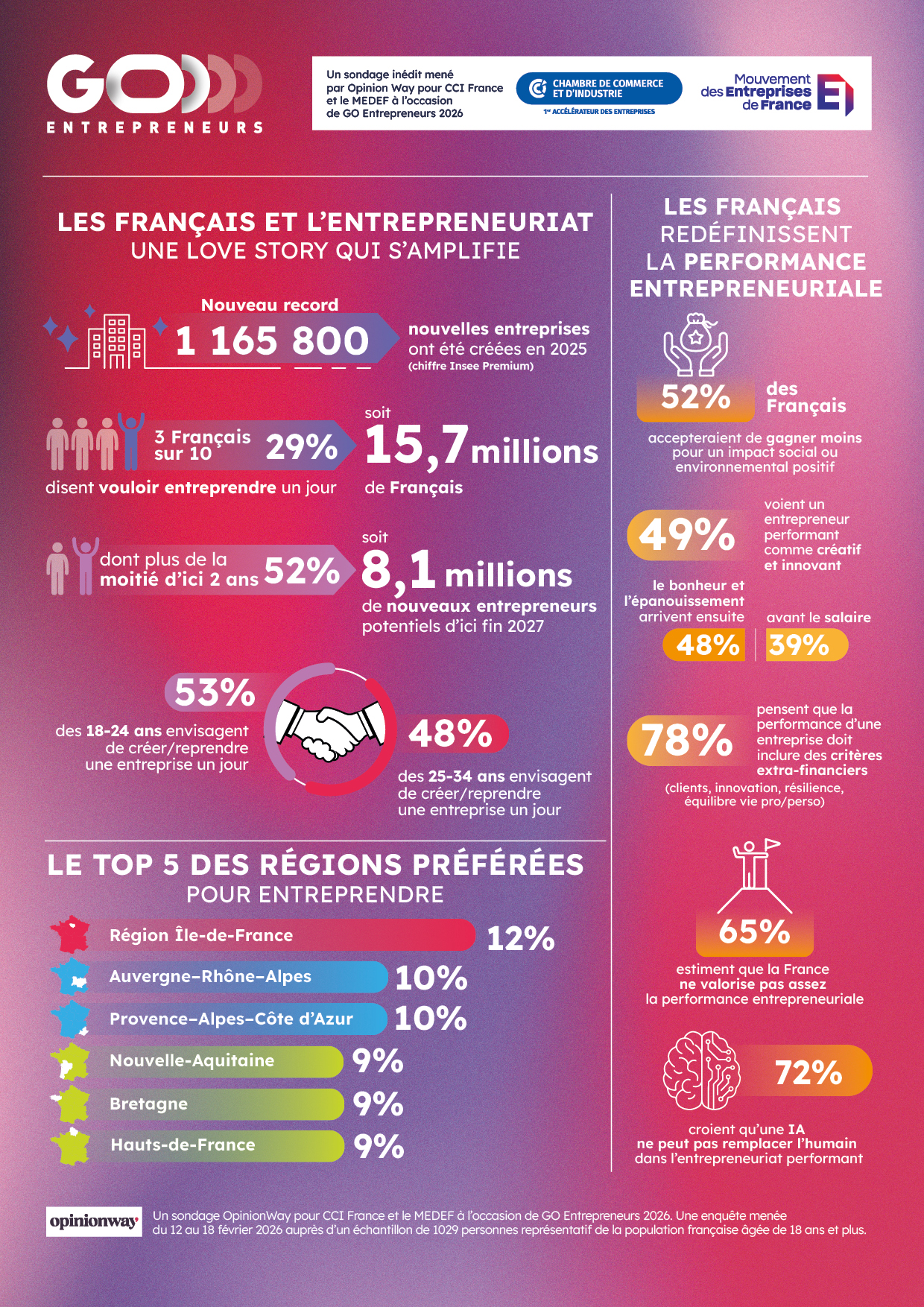L’étude barométrique « Les Français redéfinissent la performance entrepreneuriale », réalisée pour Go Entrepreneurs, CCI France et le Medef, est destinée à comprendre et analyser les perceptions sur l’entrepreneuriat et la création d’entreprise.